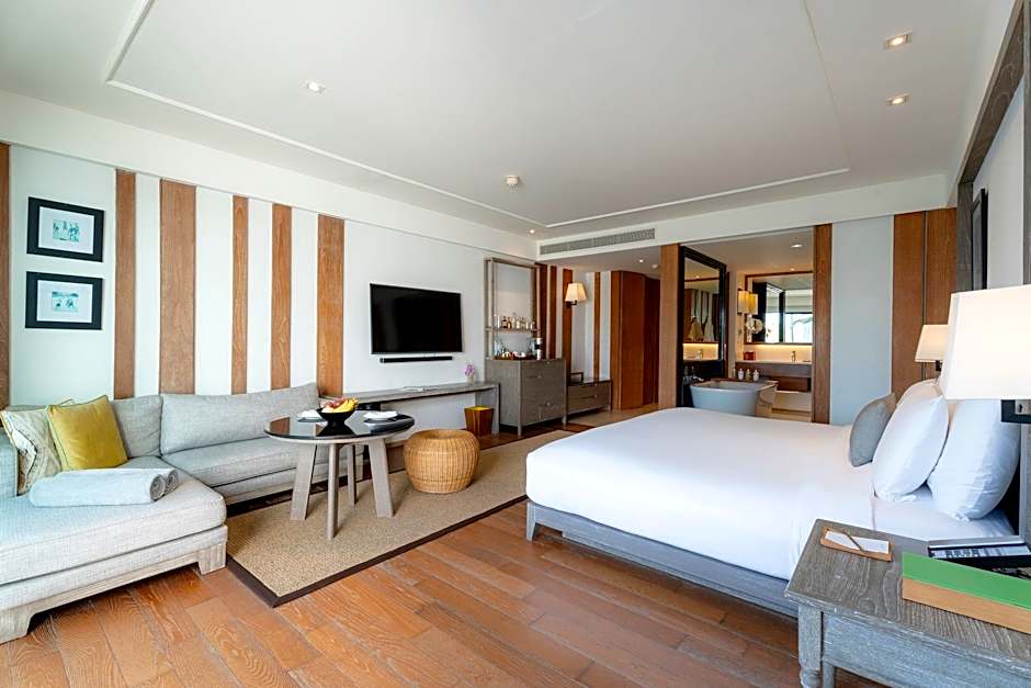 Located on the 8th and 9th floors (the elevator up to 6th floor), the 47 sqm Deluxe Ocean View Rooms feature an oversize king bed and striking interior design in clean lines, warm wood tones and richly textured carpets. Interiors open to a 5sqm terrace with panoramic views over the bay. Rooms feature high-definition interactive TVs, bedside USB charging sockets and tea- and coffee-making facilities. Divided from the bedroom by a sliding door, the luxurious bathrooms offer space to relax and refresh.